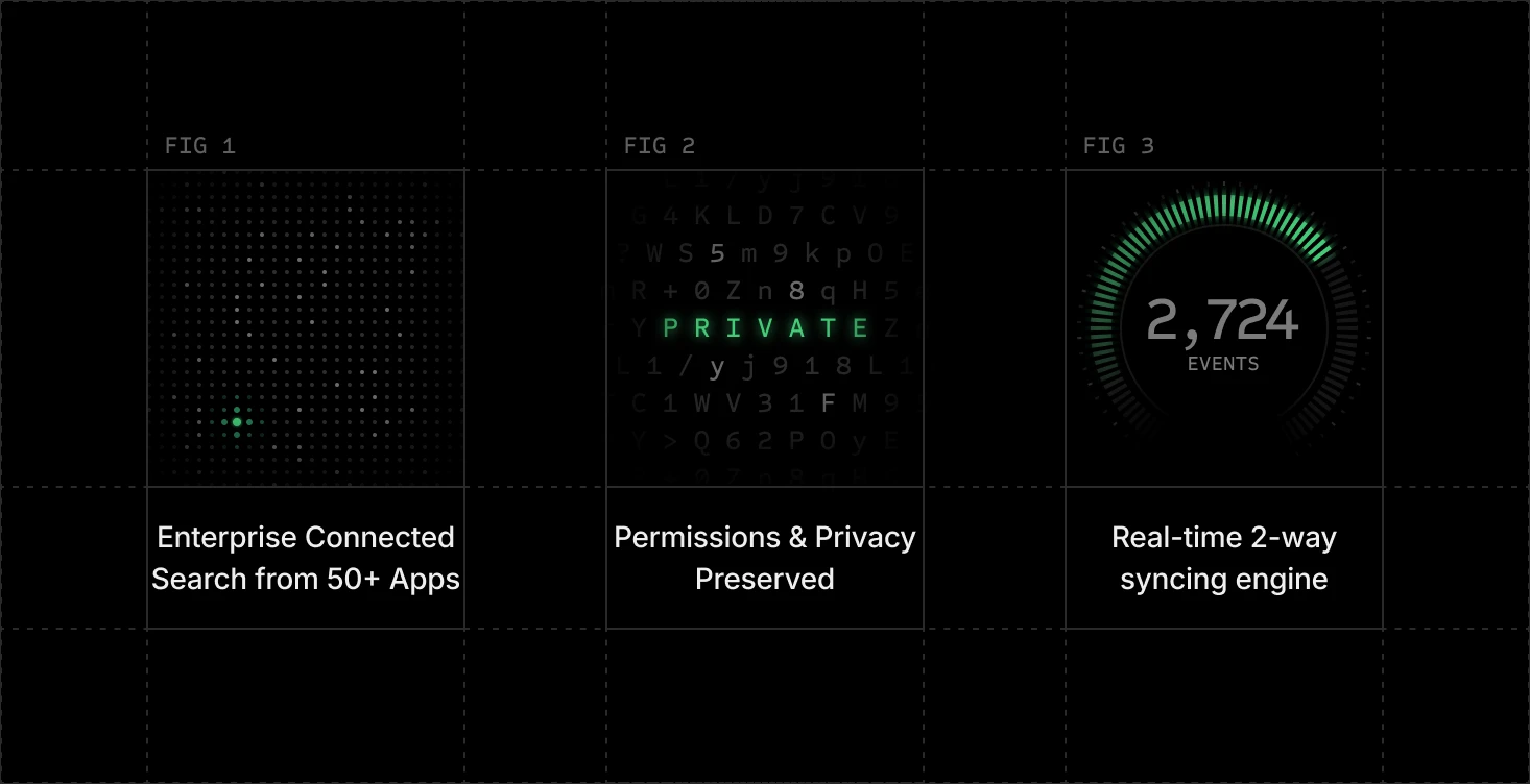 Proprietary real-time syncing engine with world-class retrieval from fine-tuned embeddings. Enterprise search from infinite connected knowledge.